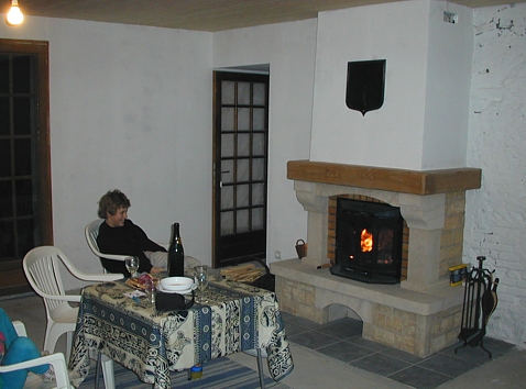 | Nach dem Einbau des Cheminées wurde die Decke getäfert und unsere Bruchsteinmauer, die wir so erhalten wollten, verfestigt. Natürlich wurden auch sofort die ersten Feuerchen genossen. Jetzt stand der Vollendung nichts mehr im Wege. Boden verlegen, Radiatoren streichen Wände malen usw. Vor der Isolation wurde übrigens noch die marode Elektroinstallation unseres Hauses erneuert, so dass wir jetzt nur noch ein kleines Elektro-Paneau im Salon haben, das auf dem neusten Stand ist. |